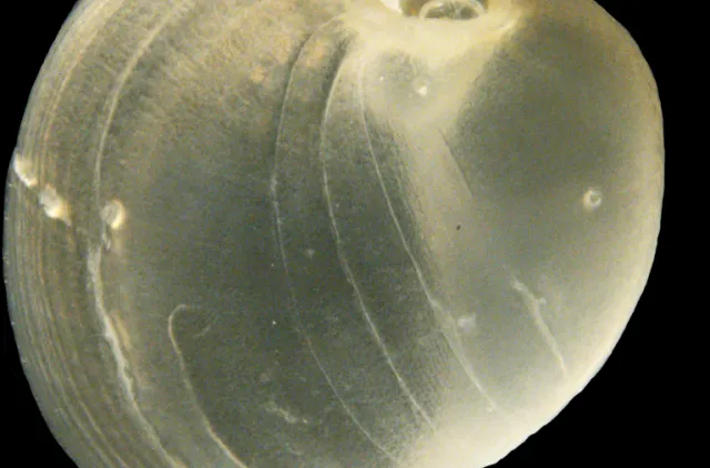 Det tynne skallet er innvendig og brunaktig gjennomsiktig. Skallet er kuleformet, åpningen er stor og kanten er glatt. Toppen av skallet (apeks) er avstumpet og litt sunket inn i skallet. Skallet har en umbilikalkanal (umbilicus). Overflaten av skallet er glatt og har ikke noe tydelig mønster. Størrelsen på skallet varierer mellom 2–6 mm.
