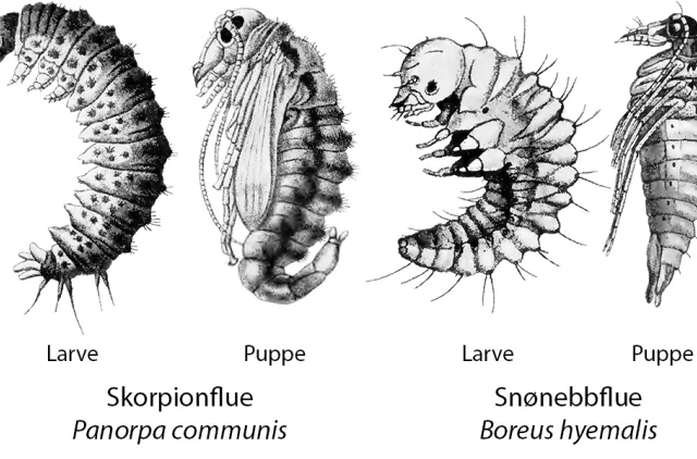 Larven har velutviklet hode og langstrakt, myk kropp med rundt tverrsnitt. Den minner i formen om en sommerfugllarve. På hver side av hodet finnes et fasettøye bestående av syv eller flere enkeltfasetter (opp mot tretti hos skorpionfluene). Brystbeina består av fem ledd, hvorav det siste ender i en enkelt klo. Hos skorpionfluene har larven vorteføtter på de åtte første bakkroppssegmentene samt på endeleddet. De siste kroppssegmentene har lange vorter på ryggsiden, hver utstyrt med en kraftig børste. Snønebbfluens larve er krum og tykk og mangler vorteføtter og lange ryggvorter. Brystbeina er uvanlig skrevende, og det innerste segmentet oppsvulmet.