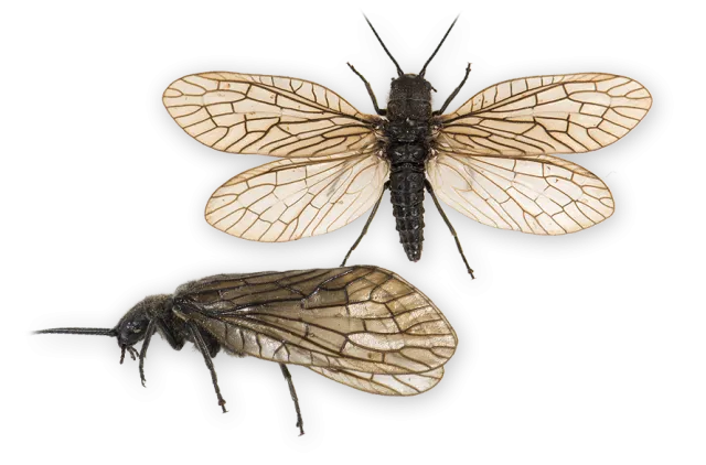 - Hodet er meget bredt og avflatet med fremoverrettede munndeler. Fasettøynene er små, og panneøyne mangler. Antennene er lange og mangeleddete. Munndelene er enkle og bitende.