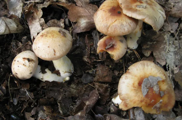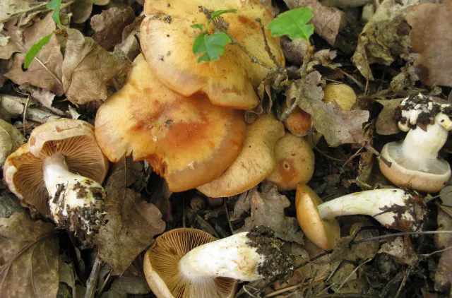 Skivene er relativt tettstilte og livlig okergulbrune som unge. Stilken varierer fra å være jevntykk til klubbeformet, og har gjerne tilspisset basis. Den er 3–6 x 1–1,6 (basis opp til 2,5) cm lang, med tydelig lysgule velumrester, som øverst er konsentrert i en trådet ringsone på blek bunn. Nedre stilkdel blir mørkere okerbrun ved trykk og aldring. Lukten hos denne arten er ubetydelig.