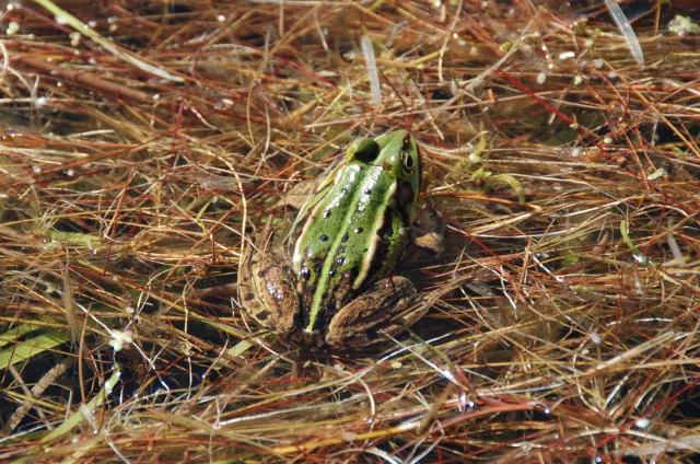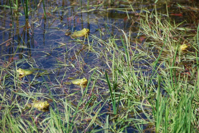 Damfroskene og hybridfroskene på Finnøy stammer fra utsatte individer fra Polen. De to artene er vanskelige å skille, og bildet kan vise én eller begge artene.