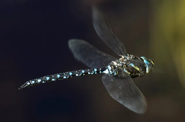 Hann av starrlibelle Aeshna juncea i flukt. Arten er en sterk flyger som bruker mye tid på å patruljere på utkikk etter bytter, partnere og rivaler.