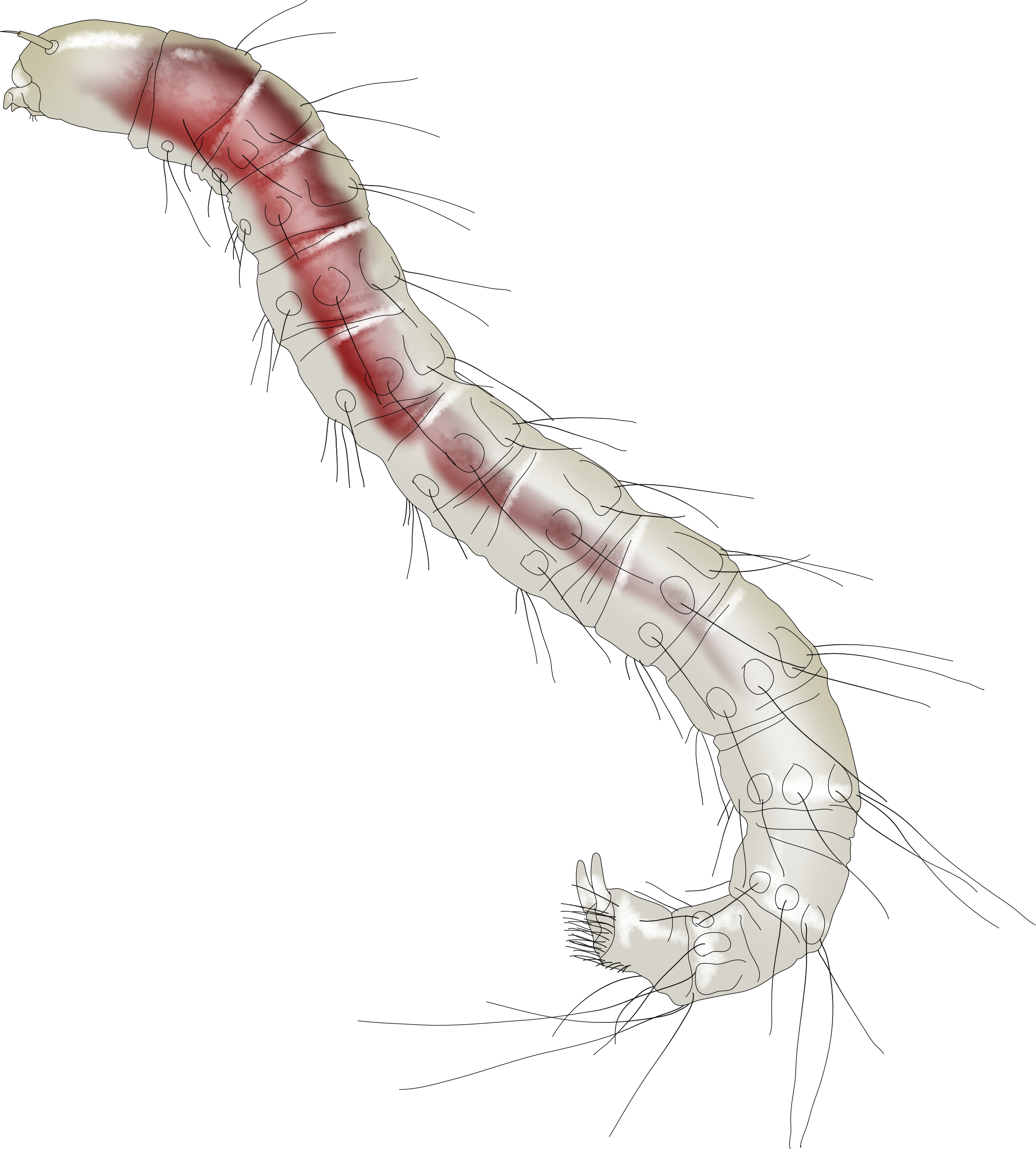 Larvene er lange og smale med rundt tverrsnitt. De mangler helt lemmer og har lange, bakoverrettede børster på kroppssegmentene. På siste kroppsledd finnes to korte vedheng. Hodekapselen er velutviklet men mangler øyne. Antennen består bare av ett ganske langt ledd. Munndelene er bitende.