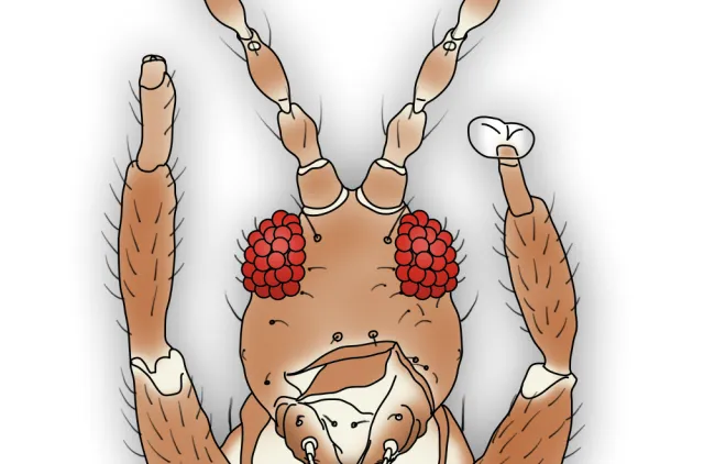 Bildet viser den asymmetriske munnkjeglen som beskytter sugemunnen (stiletten). På venstre frambein sees den oppblåsbare fotblæren som er karakteristisk for ordenen.