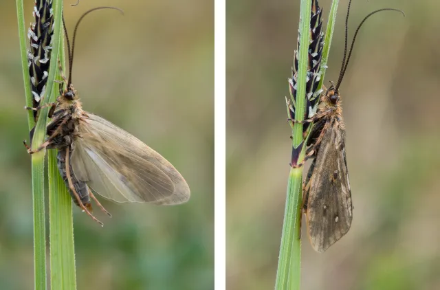 En nyklekket Agrypnia obsoleta er i ferd med å pumpe opp vingene (t.v.). Dette er den eneste gangen den sitter med vingene hevet over ryggen. Så snart vingene er tørre, legges de ned i taklagt positur (t.h.).