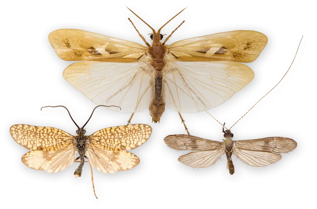 Vårfluer kan som regel ikke bestemmes til art i felt, men må samles inn og studeres under stereolupe for sikker bestemmelse.