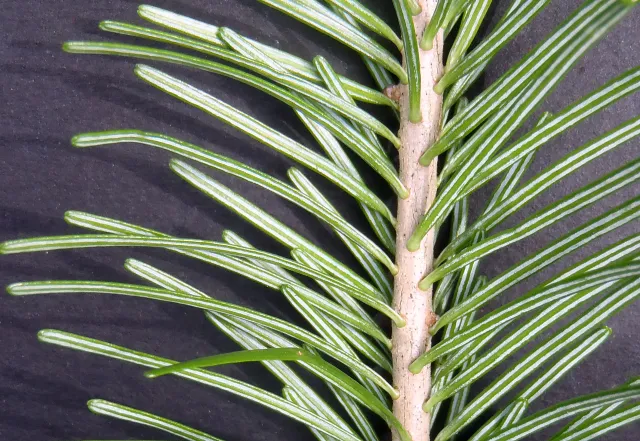 På undersida har nålene hos edelgran to smale, svært lyse band med spalteopningar.