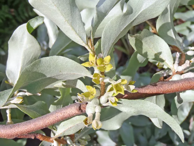 De tokjønnete blomstene dannes på eldre skudd og sitter 2–3 sammen i bladhjørner. De mangler kronblad; blomstene er dannet av fire sammenvokste, 5–10 mm lange begerblad – også de med skjoldhår. Frukten er en rund, ca. 10 mm lang falsk steinfrukt med ett frø. Den er grågul og melete.