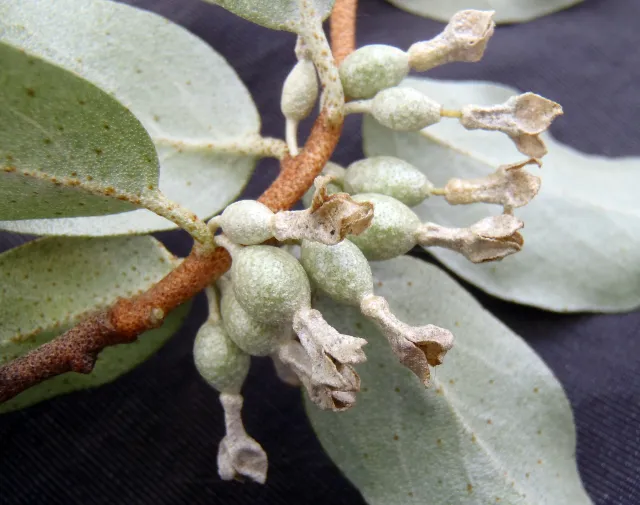 Modene frukter på sølvbusk er runde, ertestore og sølvgrå. Fra Trondheim (Sør-Trøndelag).