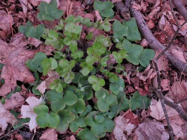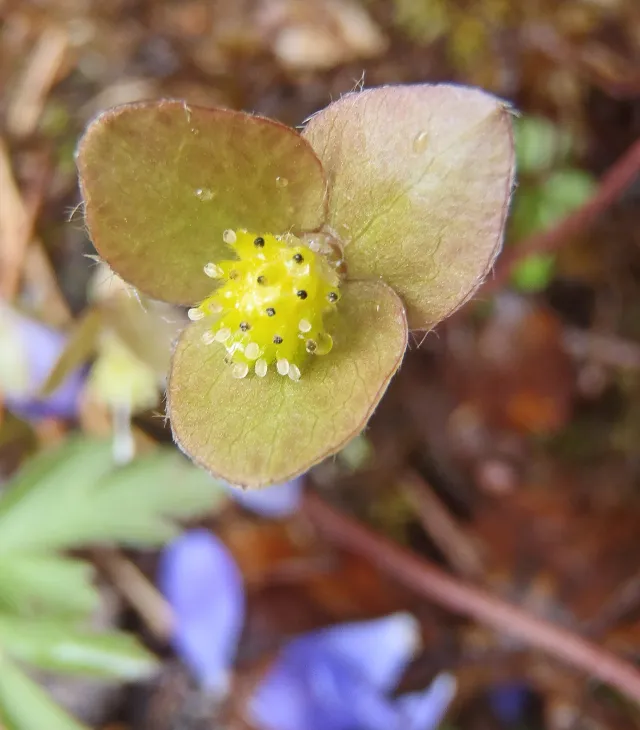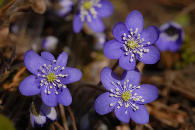 Blåveisblada er tjukke og trelappa og dessutan vintergrøne.