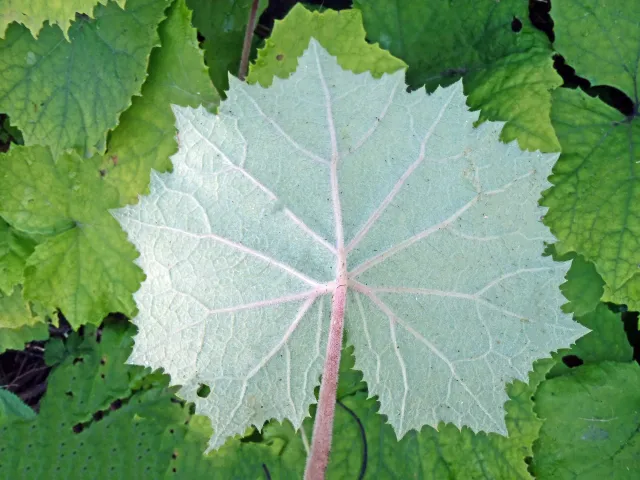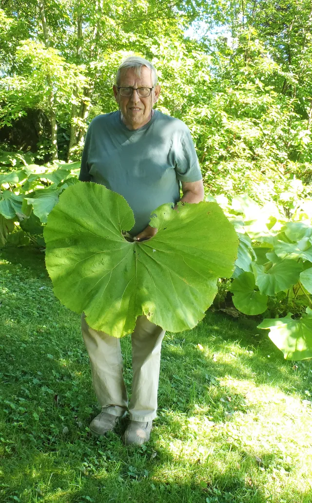 Japanpestrot har langskafta, nyreforma sommarblad som er breiare enn lange og kan bli opptil 1 m breie. Her med ein gild medforfattar som målestokk.