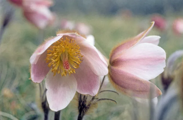 Blomane er fiolette utvendes med lange silkehår, og dei er kvite eller stundom lysfiolette utvendes.