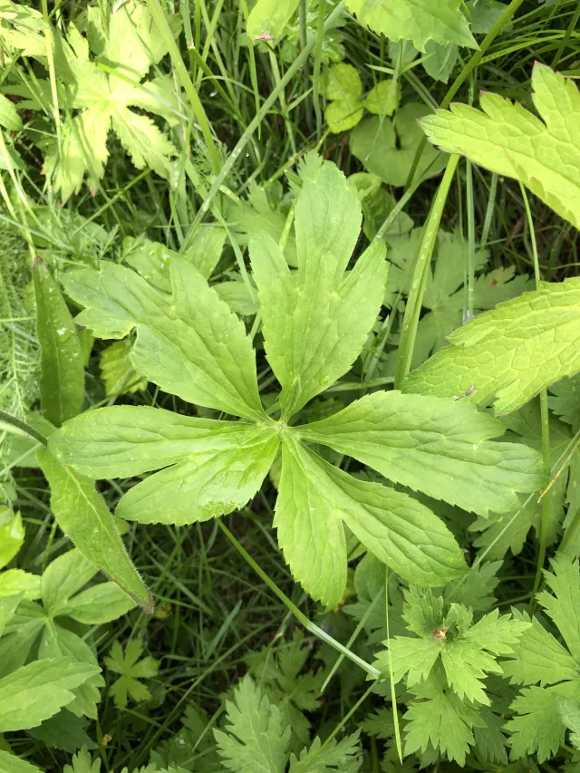 Grunnblada er store, kantete i omriss, og handflika med fem hovudflikar.