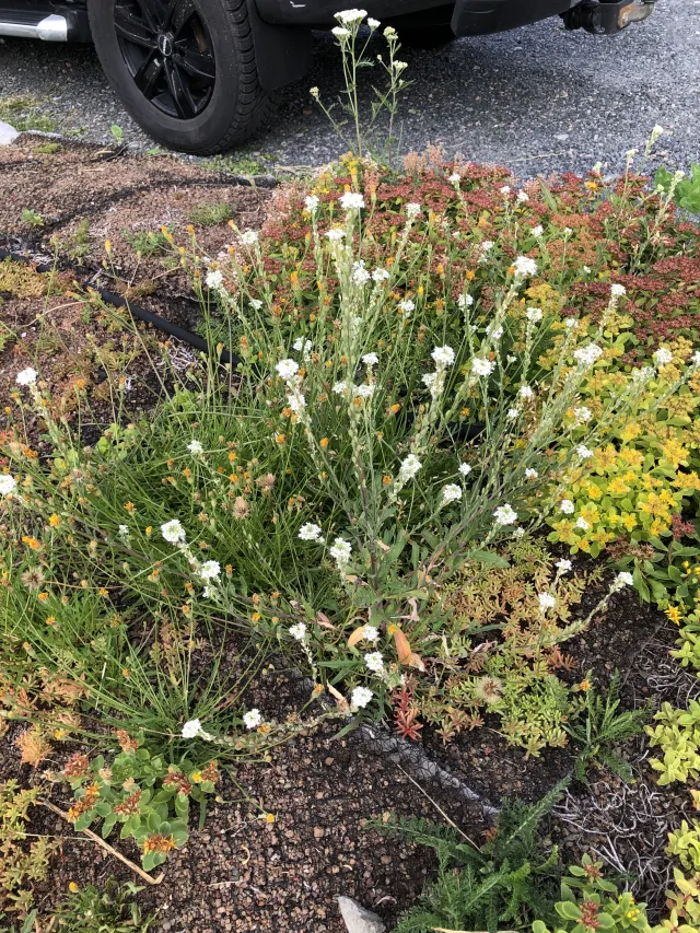 Kvitdodre er vanleg på skrotemark av ymse slag, her langs ein vegg på Tyholt i Trondheim.