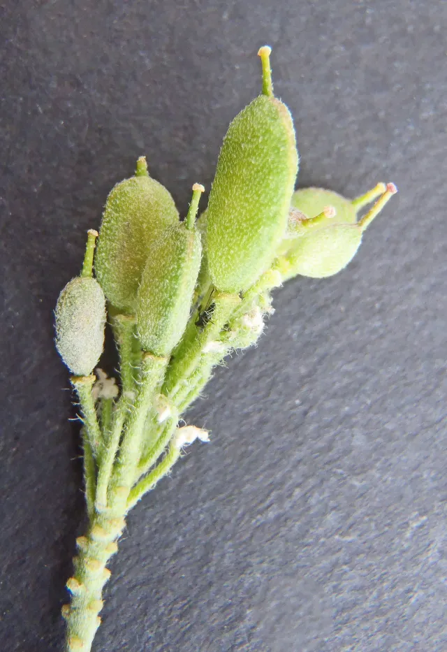 Frukta er ei opprett, litt oppblåst, elliptisk kortskulpe som ligg inntil eller sprikjer noko ut frå stengelen. Skulpeveggane er utan tydeleg midtnerve. Griffelen er lang.