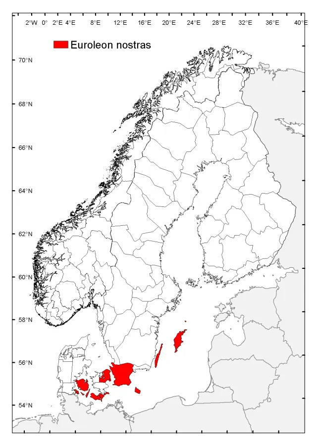 Euroleon nostras er ikke funnet i Norge. I Norden er den kjent kun fra Sverige og Danmark.