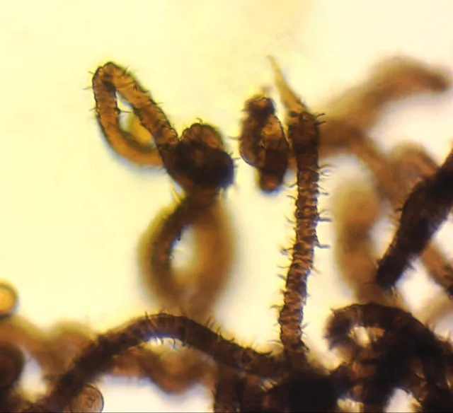 Metatrichia horrida er en sjelden slimsopp som danner tette grupper av mørkerøde til nesten svarte, nærmest sylindriske sporokarper, oftest på et utstrakt mursteinsrødt hypothallus. Spore- og kapillitiemassen er blekt oransjerød.