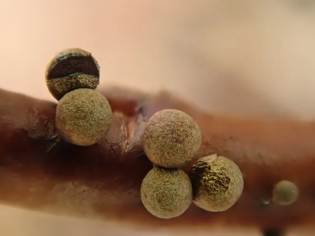 Sporokarper. Den til venstre har sluppet de fleste av sporene, mens den til høyre fortsatt har en del sporer.