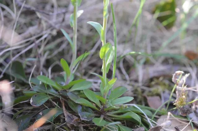 Planten er snau og blågrøn. Grunnblada er langskafta, spatelforma og heile eller grunt tanna.
