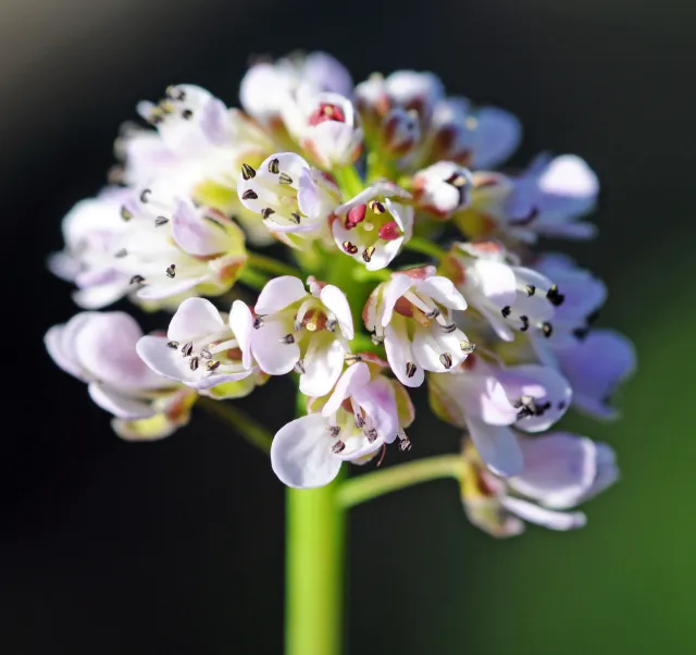 Blomestanden er ein kort og tett klase med kvite eller bleikt fiolette kronblad. Pollenknappane er fiolette.