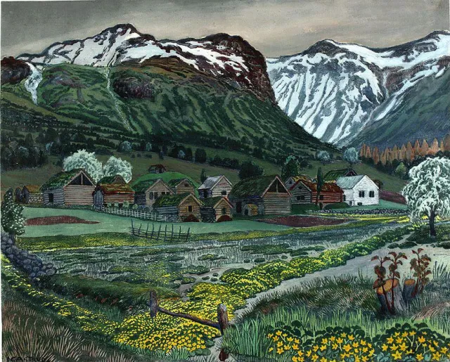 Nikolai Astrup sitt stemningsfulle maleri "Soleienatt" syner soleihov som fargar grøfter og bekkekantar gule om våren i Jølster.