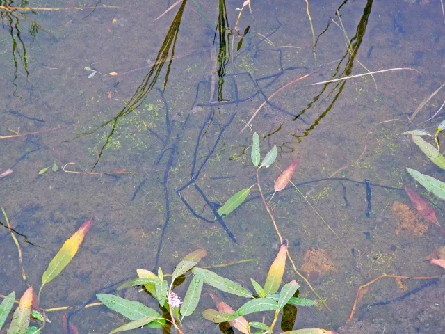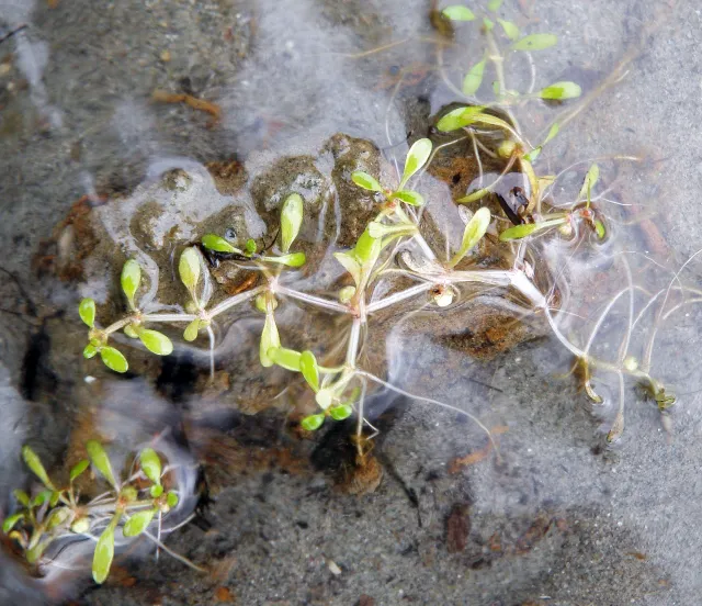 Korsevjeblom er synlig som små, grønne flekker i mudderflaten, men de kan henge sammen under overflaten. Her sammen med vass-slirekne Persicaria amphibia. Sør-Varanger, Svanvik (Finnmark).