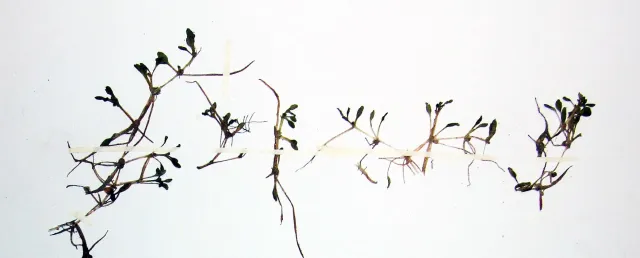 Korsevjeblom Elatine hydropiper. Høylandet, Eidsvatnet (Nord-Trøndelag).
