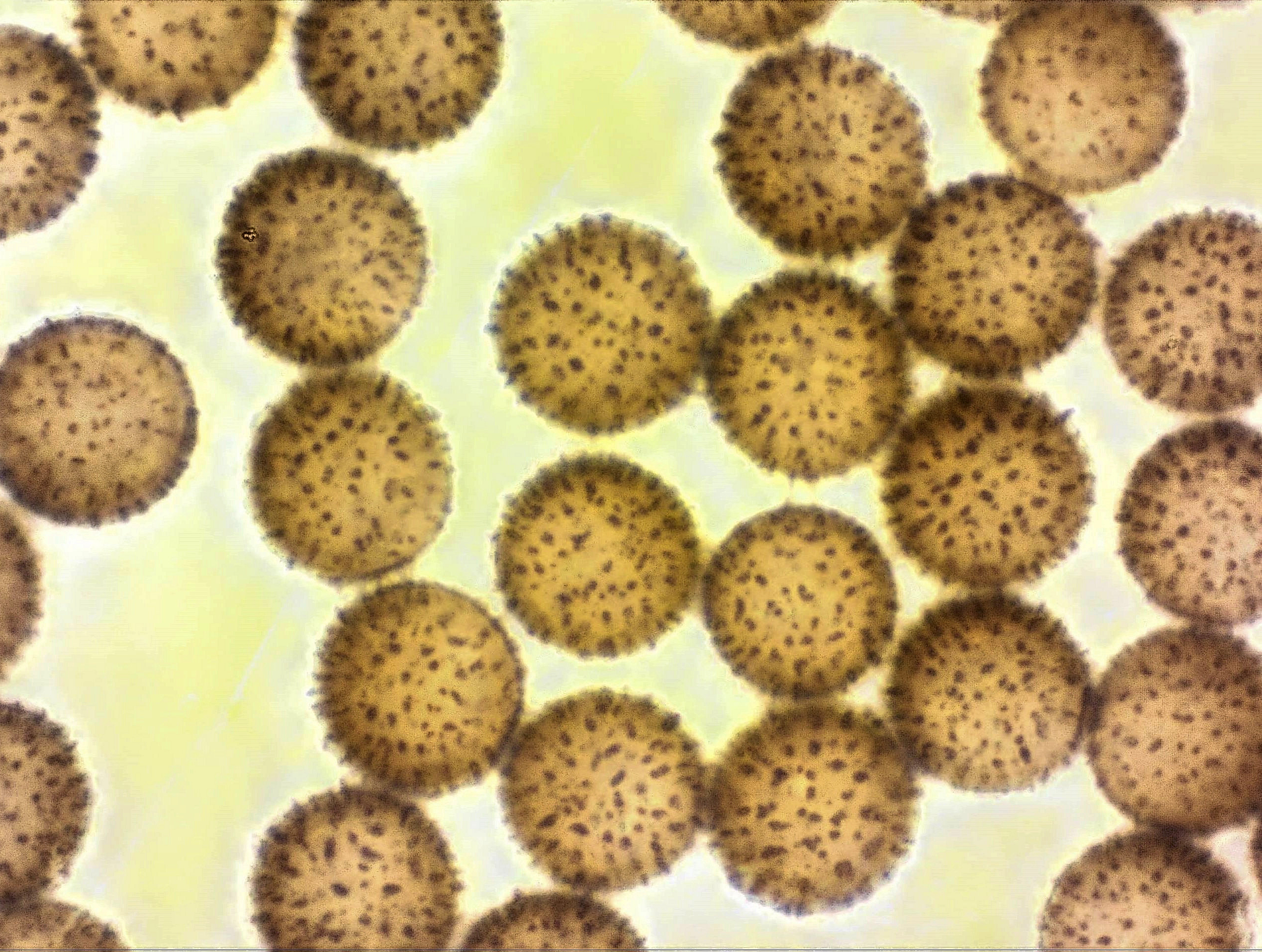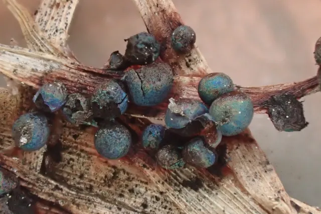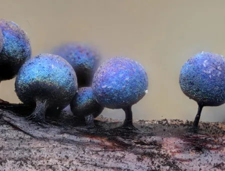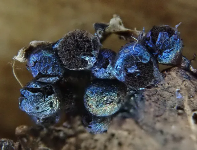 Lamproderma spinulosporum har tette samlinger av blått eller fiolett metallglinsende kuler uten skaft. Dette er en slimsopp som forekommer på blant annet tynne grener, mose og visne urter om våren i snøsmeltingen.