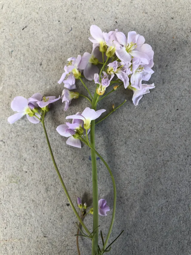 Kronblada er nokså store og lysfiolette, og mykje lengre enn begerblada. Fruktene utviklar seg oftast ikkje; planten formeirar seg hovudsakleg med småblad som fell av.