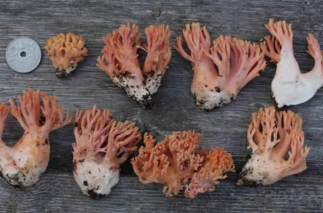 Fruktlegemene er relativt små til middels store, ofte slanke. Fargen er sterkt rosarød (lakserosa til vinrød), med gule greinspisser/tupper som helt ung. Senere blekner fargen til gråoker med rosaskjær. Også kjøttet er kraftig rosarødt på unge eksemplarer. Arten har ingen spesiell lukt.