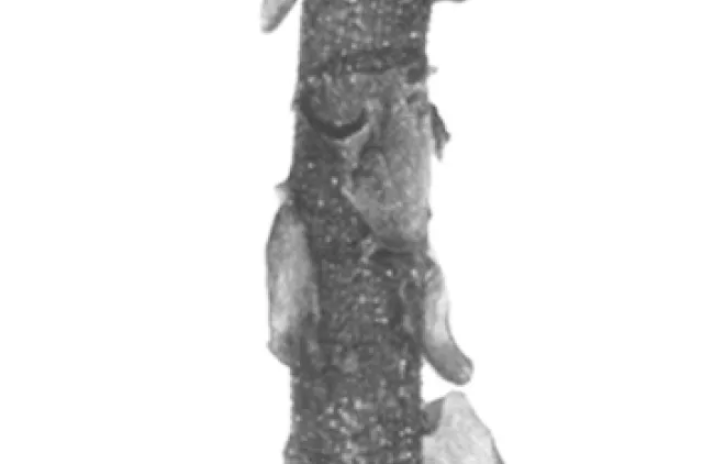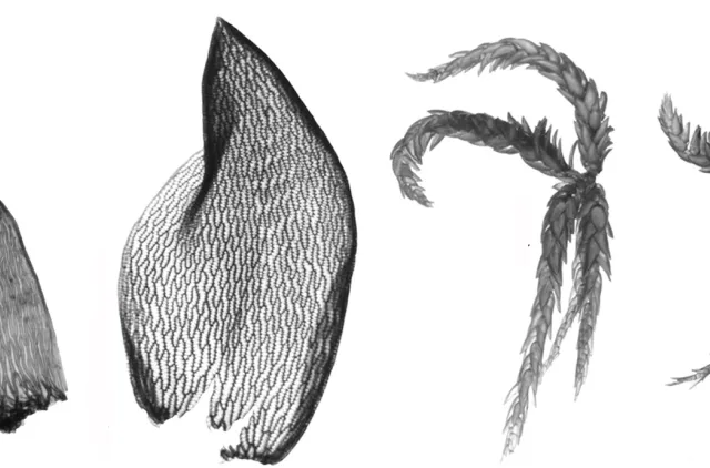 Til venstre: Stengelblad og greinblad. Til høyre: Greinknipper
