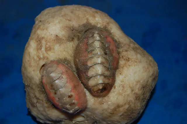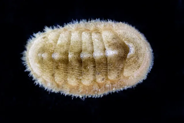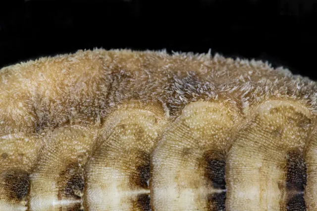 Kapperanden hos Hanleya hanleyi er bred, og skallplatene overlapper hverandre.