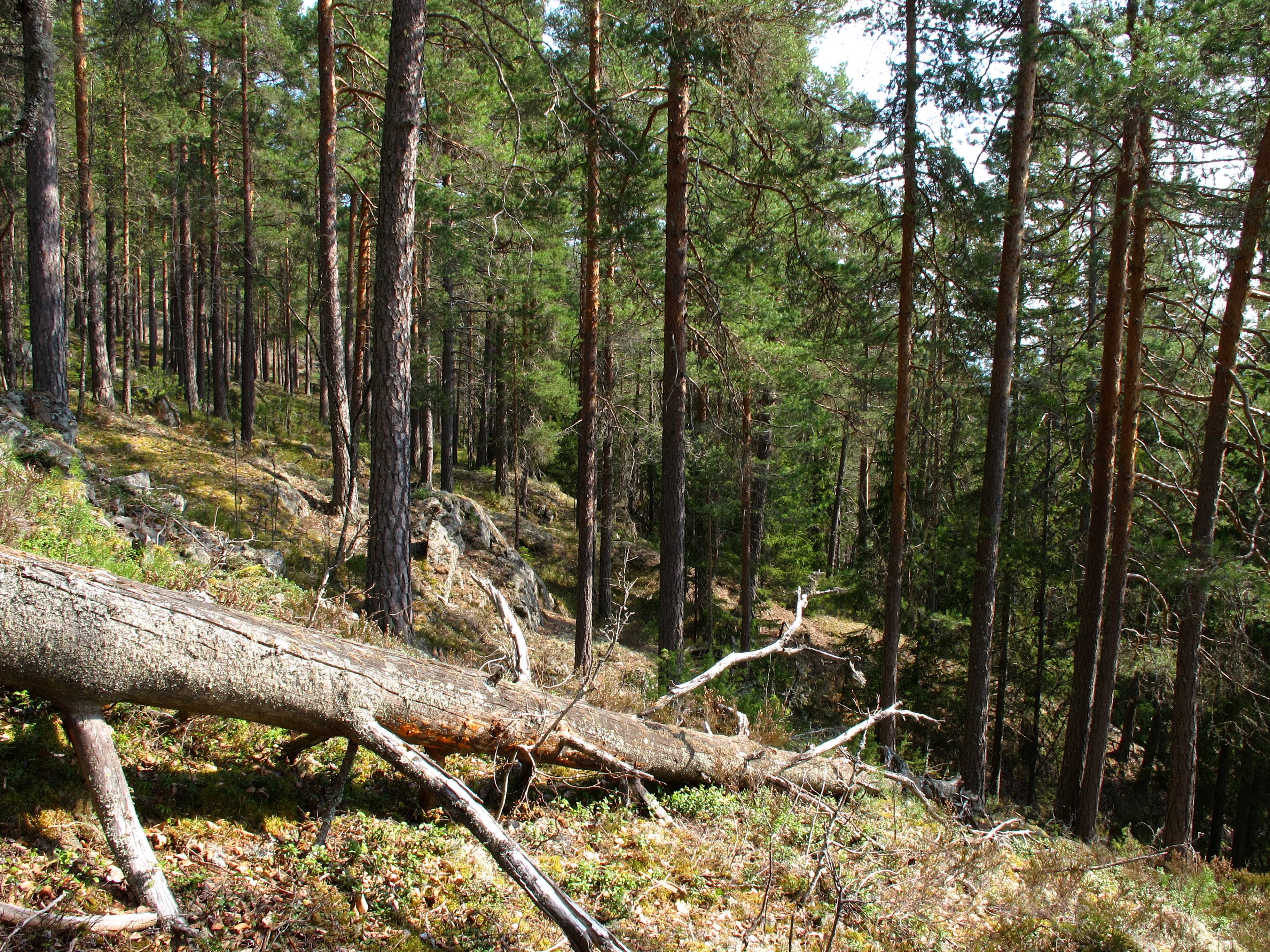 Oransjekjuke finnes i furuskog der den vokser på furulæger. Bilde fra Holmenåsen i Sigdal kommune.