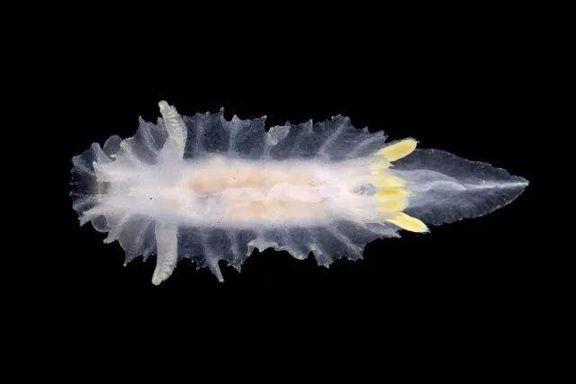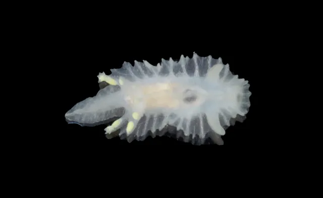 Denne hvite og gule nakensneglen har et svært karakteristisk utseende. Den regnes som svært sjelden og er bare funnet noen få steder langs kysten, men kan være tallrik lokalt.