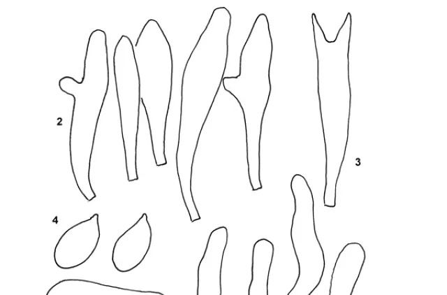 1. Hatthudshyfer, 2. Cheilocystidier, 3. Basidium, 4. Sporer, 5. Caulocystidier.