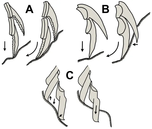 B – Dolkformede tenner som punkterer og kutter seg gjennom celleveggen i svingende bevegelse