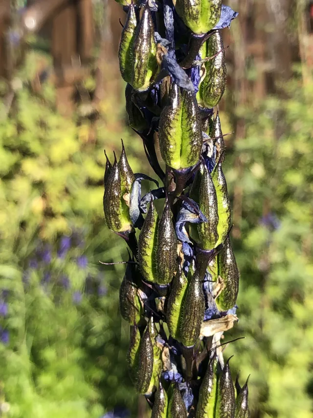 Hageriddarspore vert dyrka som prydplante og kan frøforville seg, men står ofte att i hagar som her på Kongsvoll i Oppdal.