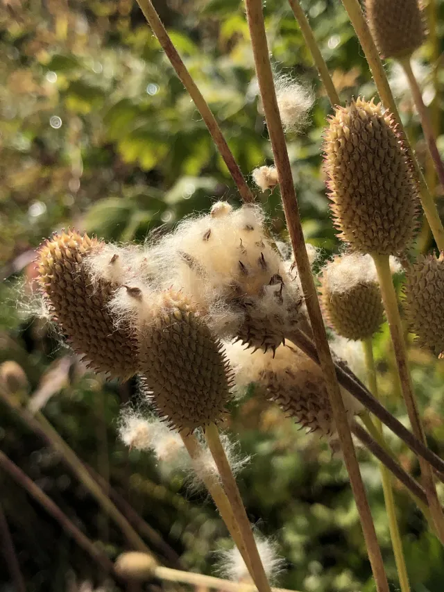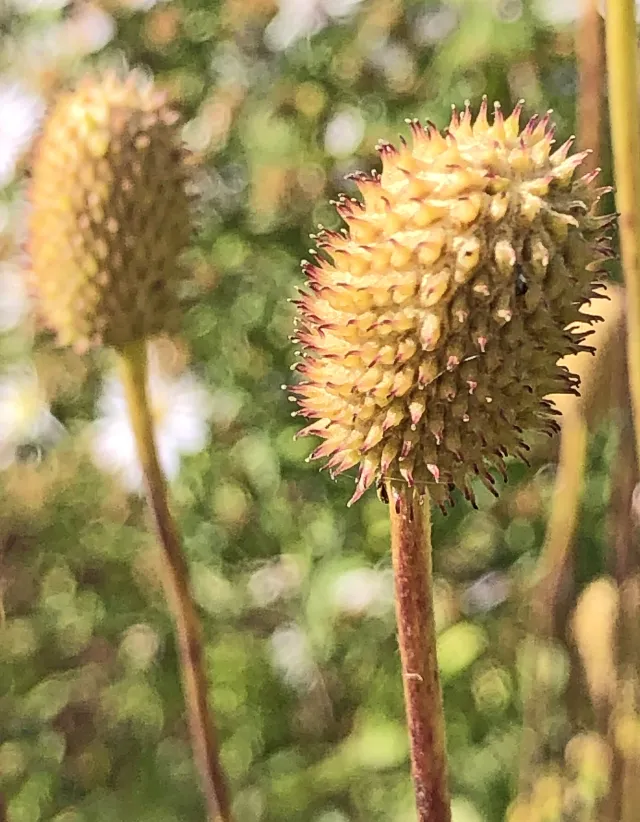 Fruktene sit i valseforma hovud med mange smånøtter.