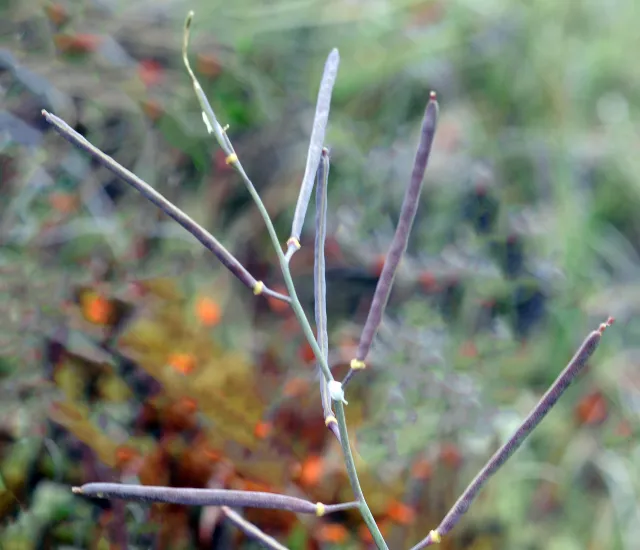 Frukta er ei nokså tjukk langskulpe som sit på eit sprikjande skaft som er mykje grannare enn skulpa.