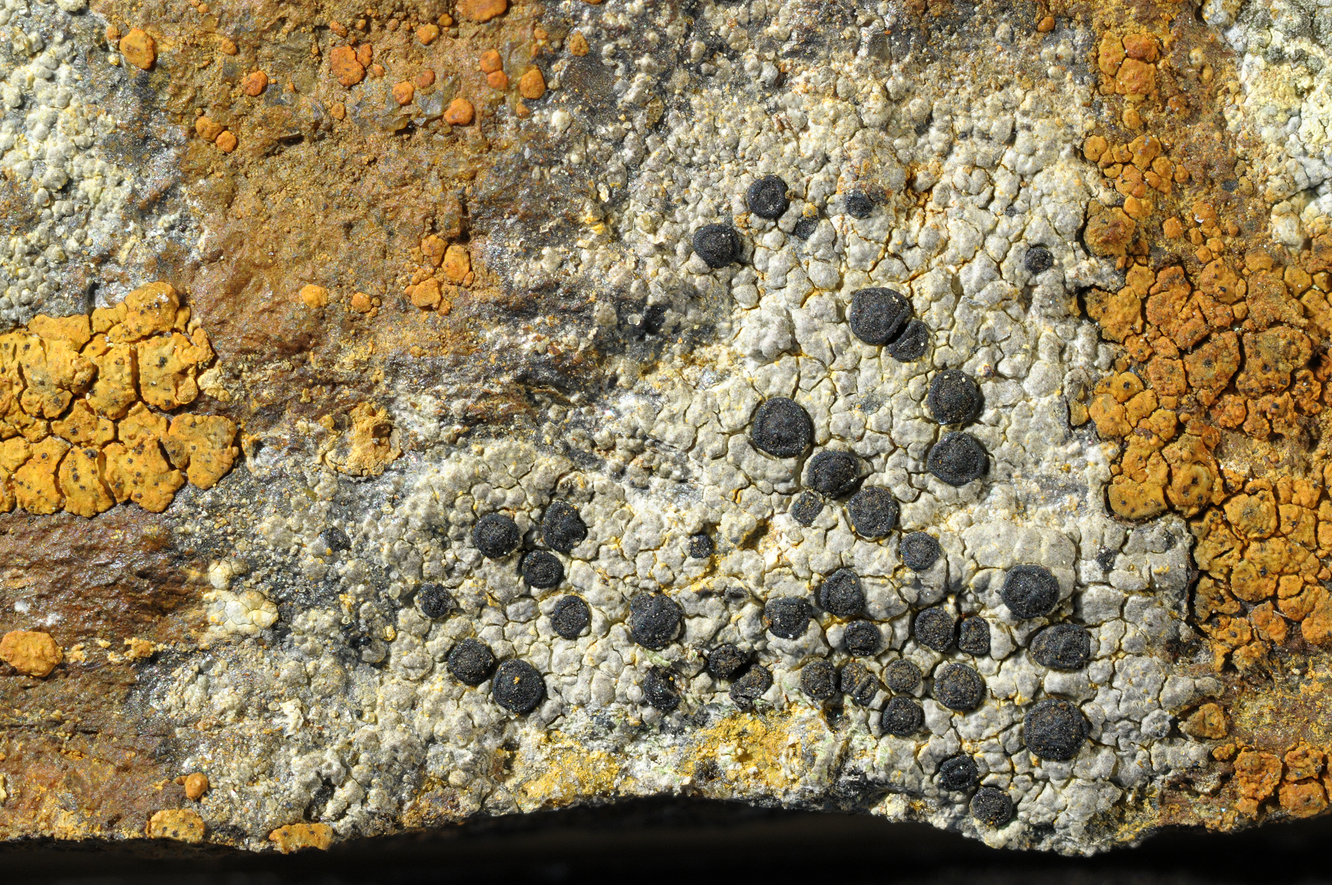 Apotheciene blir opp til 1 mm i diameter, er svarte og ikke pruinøse, er runde, svakt konkave til svakt konvekse, med en tykk og vedvarende kant og ofte umbonat (med navlelignende, sentralt sterilt vev) skive. Excipulumet er brunsvart i randen, noe lysere i indre del og reagerer ikke når K tilføres (excipulum K–). Hypotheciet er rødbrunt og reagerer ikke når K tilføres (hypothecium K–). Hymeniet er fargeløst. Epihymeniet er olivengrønt eller olivenbrunt og reagerer ikke når K tilføres (epihymenium K–). De er ingen krystaller eller gryn i apotheciet. Det er 8 ascosporer i hver ascus. Sporene er eumuriforme, vedvarende fargeløse eller svakt brune etter hvert og måler 20–32 × 9–15 µm.