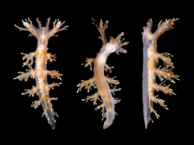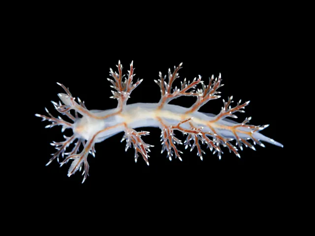 Kroppen er delvis gjennomsiktig til gråbrun, oftest med små hvite eller gulaktige flekker. Tuppen av gjellene er dekket med nærmest matt hvitt pigment. Gjennom huden er indre organer synlig, spesielt den forgrenete tarmkanalen.