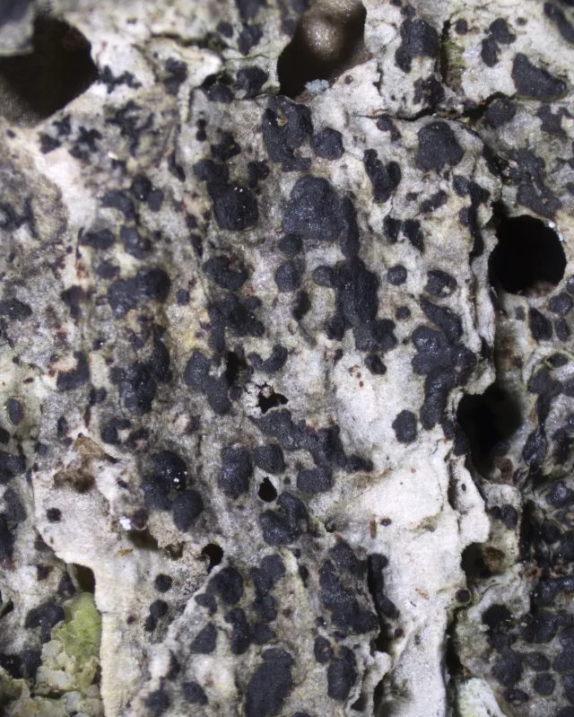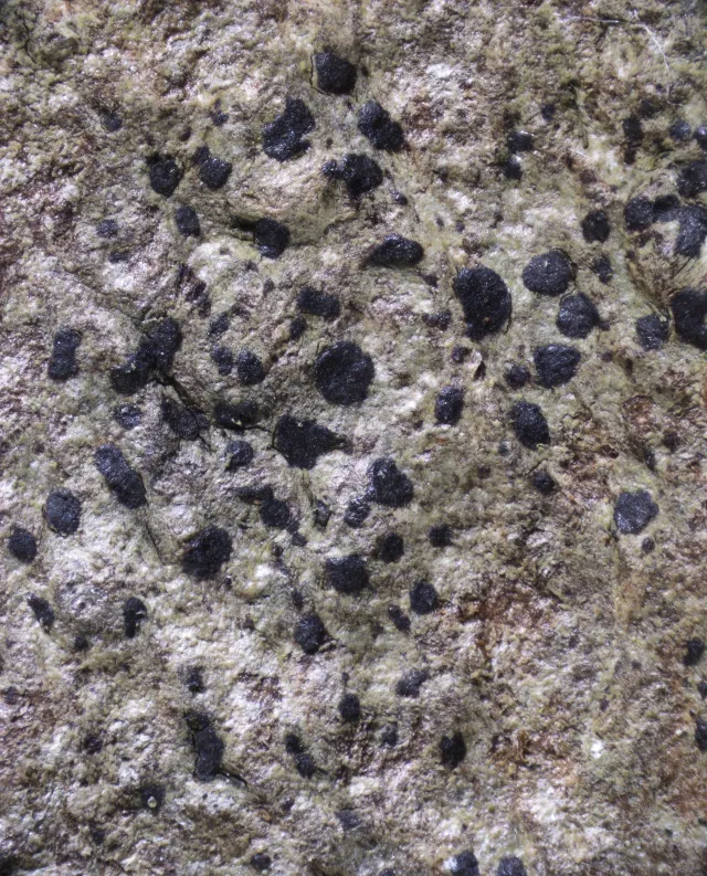 Fruktlegemene er flekkforma, uregelmessig avrunda og ligger enten i samme plan som talluset eller svakt opphøyde. De er brunsvarte, ofte med rødaktig anstrøk og uten rimaktig belegg (pruina). Fruktlegemene er ca 0,2–1,5 mm breie og 60–90 µm høye. Fruktlegemeskiva er flat til svakt konveks og ofte svakt skinnende.