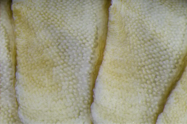 Skallplatene er dekket av små granuler i et jevnt mønster.