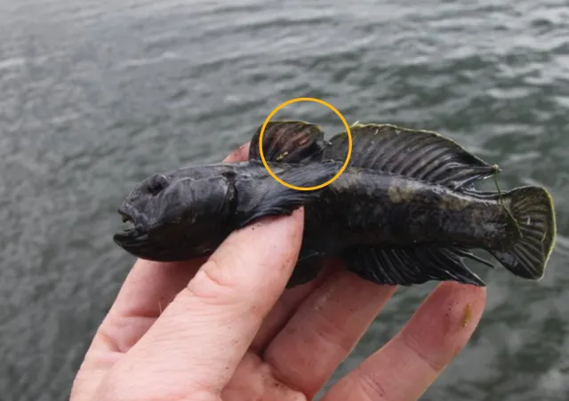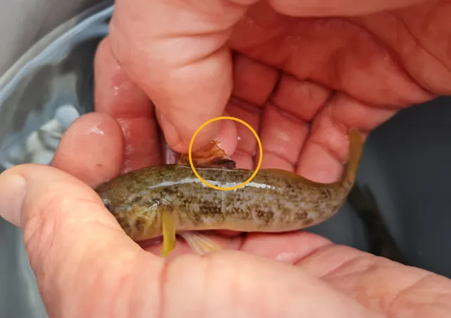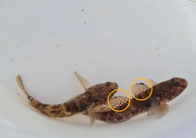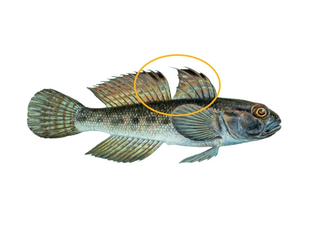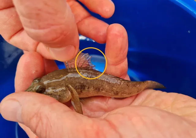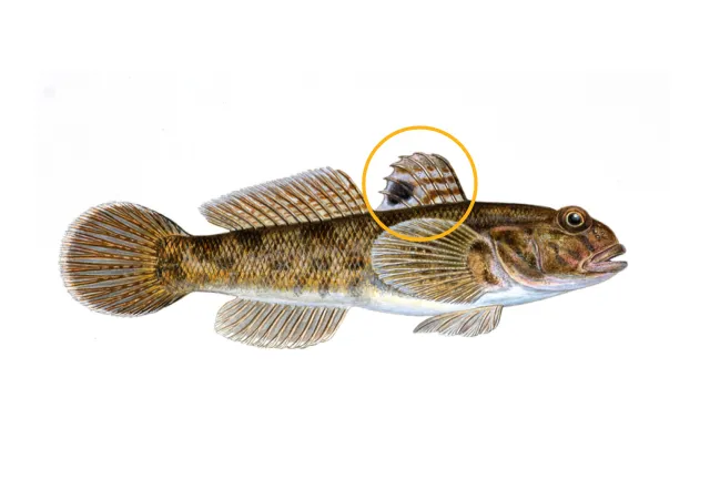 Svartmunnet kutling i Rörvik, Göteborg, juni 2022. Man ser godt den tydelige flekken i bakkant av fremste ryggfinnen.