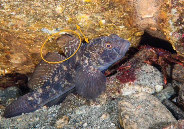 Her ser vi flekken i bakkant på fremre ryggfinne hos svartmunnet kutling.