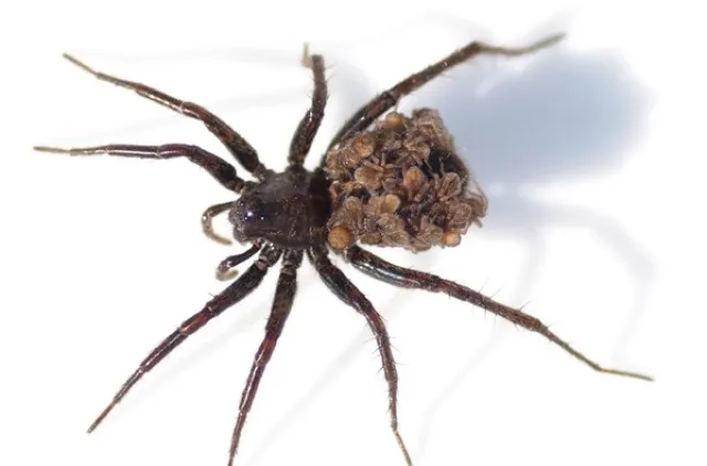 Ulveedderkopphunn (Lycosidae) med unger på ryggen.