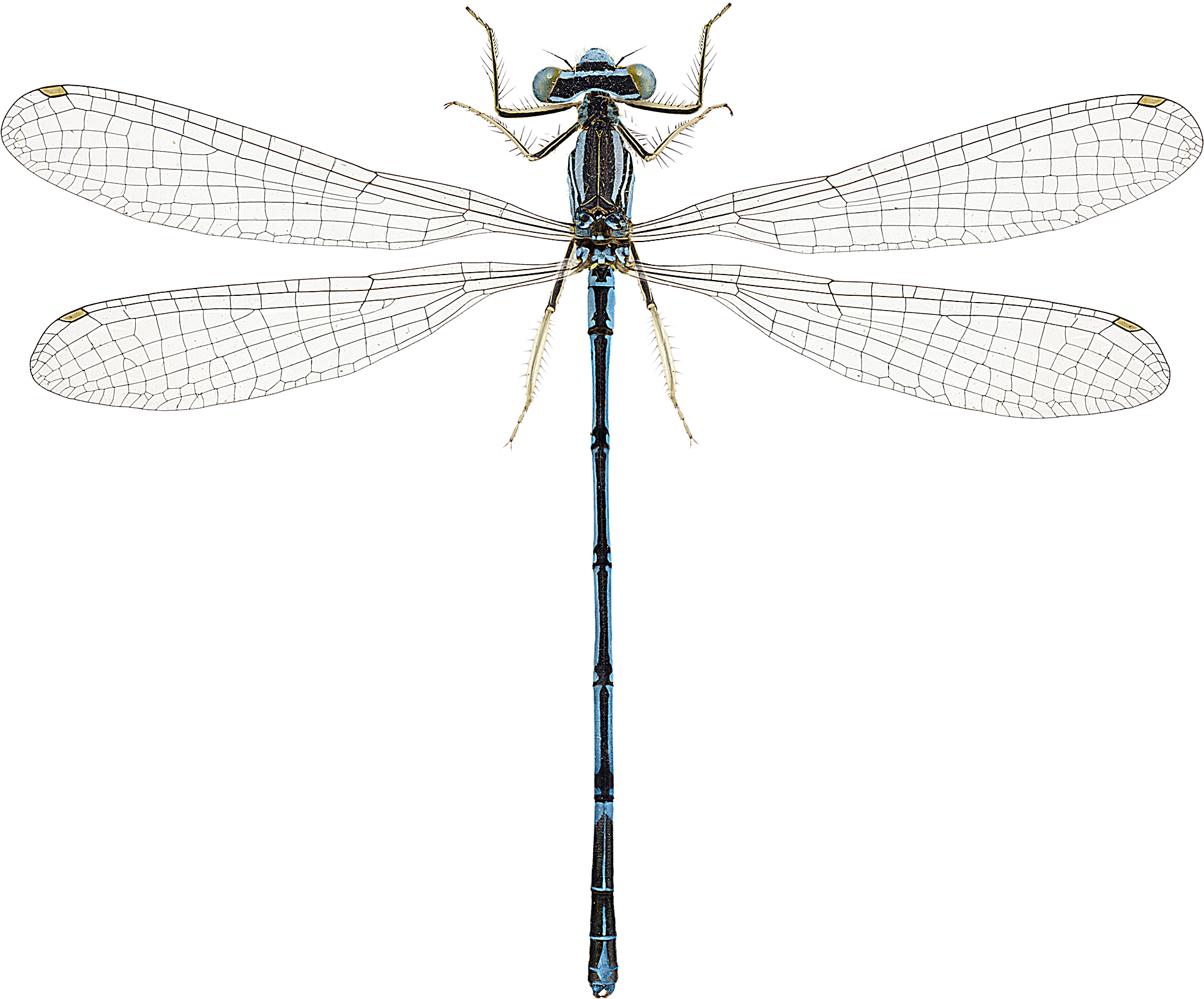 Hunn av fjærbeinvannymfe Platycnemis pennipes. Begge kjønn har fortykkede, hvite legger med en svart lengdestripe og lange, svarte kanthår. Trekket er dog mest fremtredende hos hannen.