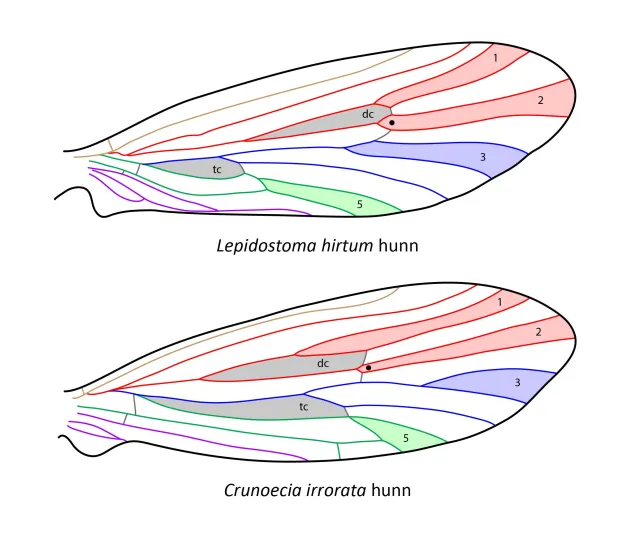 Hannens maxillepalpe er karakteristisk utvidet og skjellkledd. Hos den andre norske arten i familien, Crunoecia irrorata, består hannens maxillepalpe av ett enkelt ledd som er slankt og hårkledd.