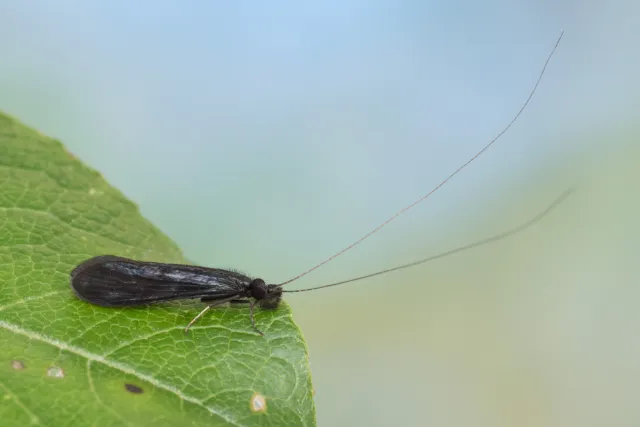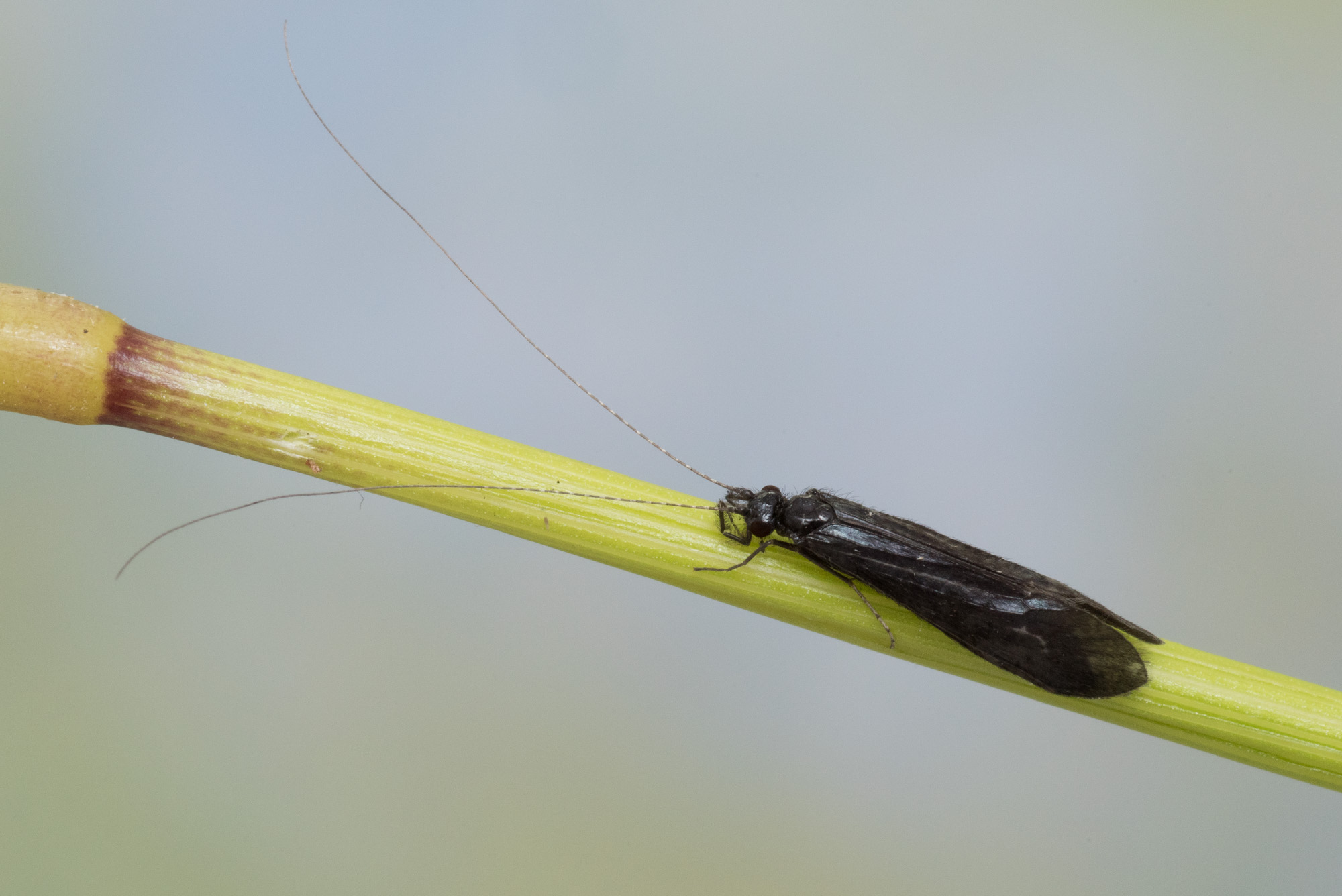 Mystacides nigra er en liten vårflue med smale, nærmest ensfarget svarte framvinger. Arten er funnet på Østlandet og i Troms og Finnmark. Larven lever på sand- og mudderbunn i sjøer og sakteflytende elver, gjerne blant vegetasjon, trerøtter eller død ved. Den bygger et rett eller svakt buet, portabelt hus av sandkorn og små pinner, barnåler eller andre plantedeler.