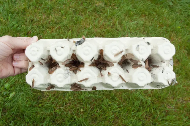 Artene i familien Limnephilidae flyr særlig på sensommeren og høsten, og mange av artene tiltrekkes av lys om natten. Bildet viser en lysfellefangst fra Røros som for det meste består av vårfluearten Anabolia concentrica og andre arter i familien Limnephilidae.